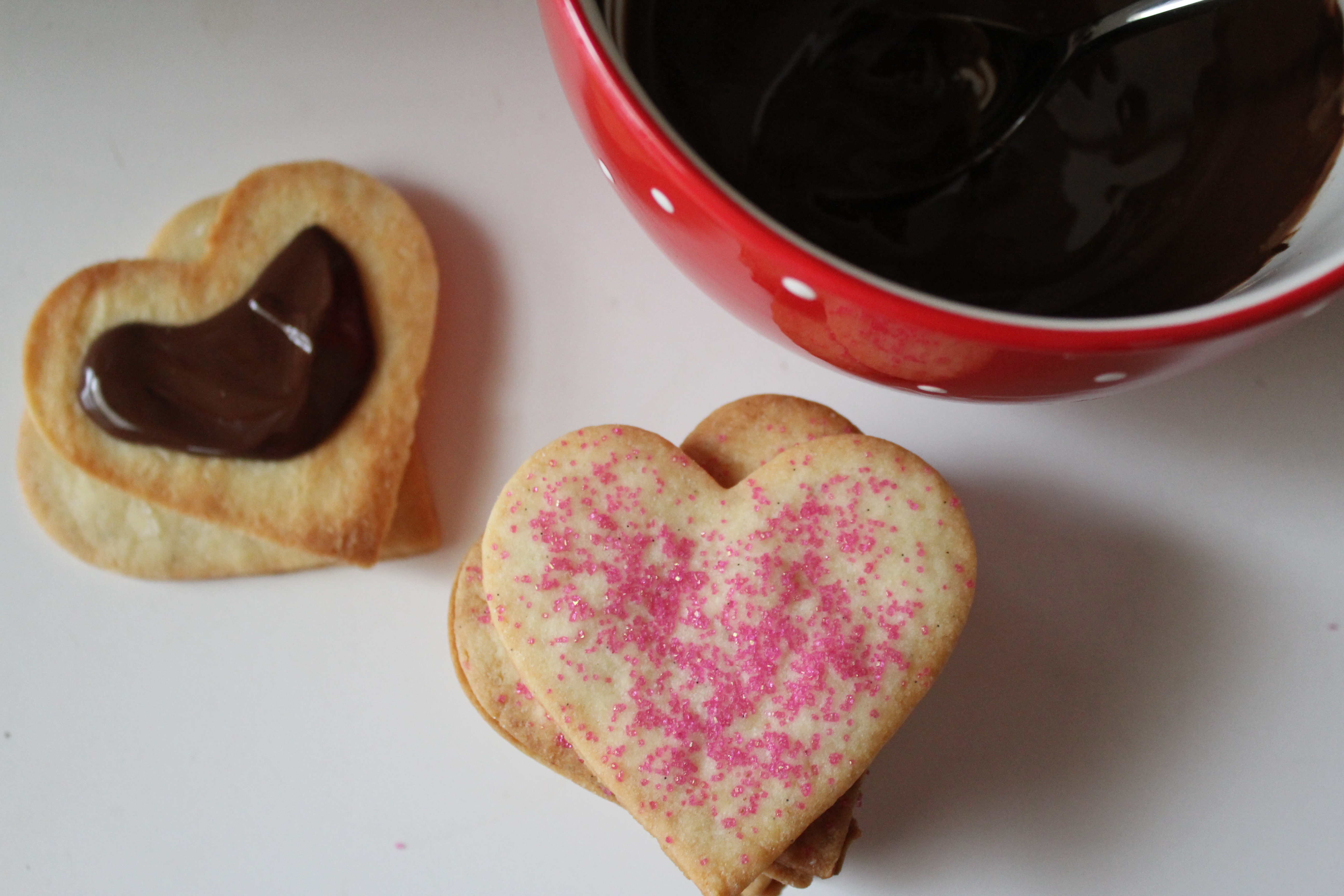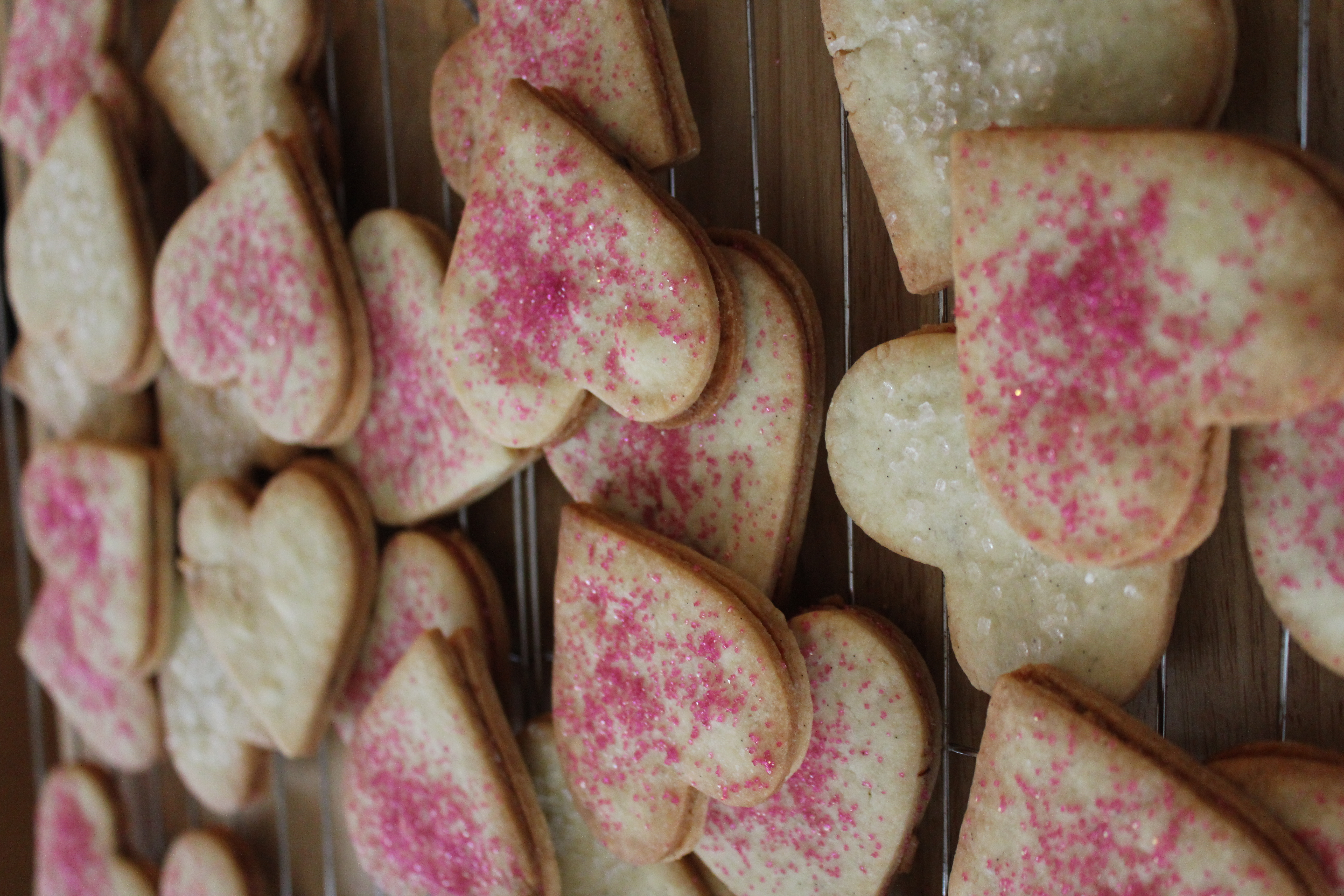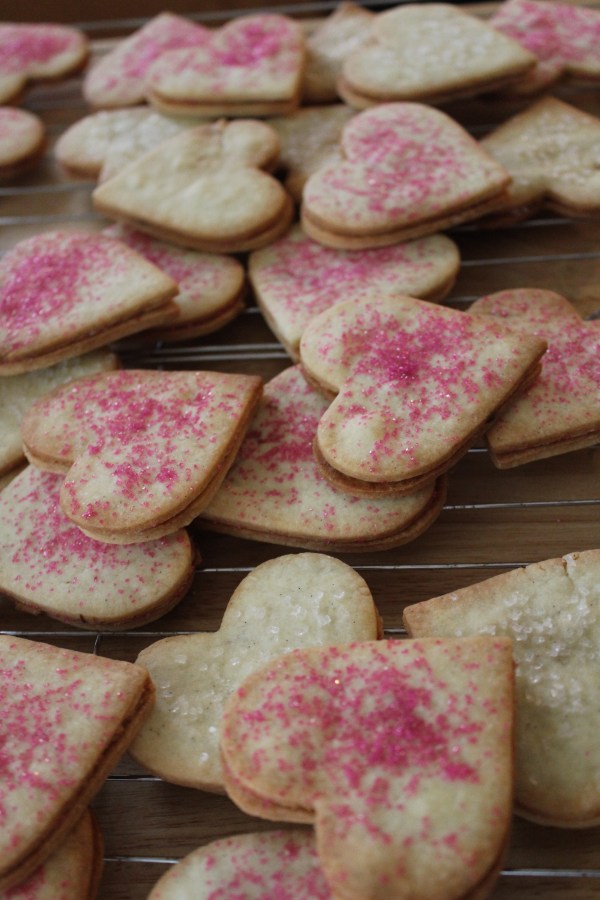 I cannot take full credit for these cookies.  The short dough recipe came from culinary school.  The idea for the sandwiches came from my sister, Lindsay, who made them for Christmas.  The cookie recipe is wonderfully easy and there are numerous things you can do with it, from tart shells to cut out cookies it never fails.  I made these as a Valentine’s treat to bring to work and they received rave reviews. You can make any shape you would like anytime of year – they might make it to the concert as our picnic dessert!