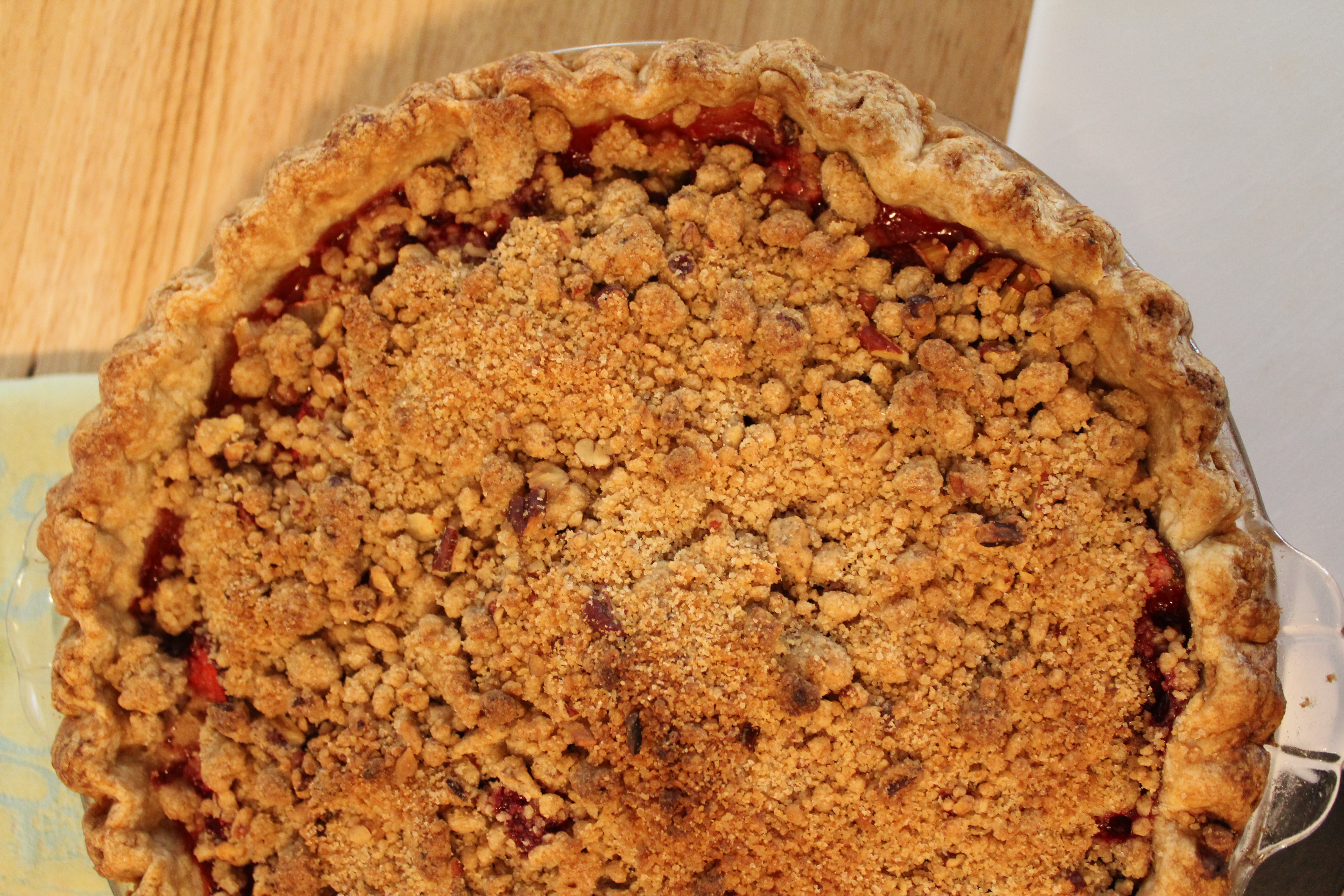 I have said before, as I have gotten older, my palette has matured. I encountered rhubarb in most of the kitchens that I worked in and began to appreciate it as its own flavor, without strawberries. Working at a restaurant and therefore being a slave to the New England growing season, I quickly learned that it was tough to actually pair the two in a dessert. With such little access to local and fresh produce all winter, I was ecstatic to have two new ingredients to work with. I preferred to let each ingredient to be featured in its own dessert.The goal of making the pie was to create something that allowed both of the fruit to shine. I think that the reason these two garden favorites pair so well, is because of the contrast – bitter rhubarb with sweet strawberries. I often find strawberry rhubarb pies to be too sweet. I held back on the amount of sugar that I mixed with the fruit, opting to add vanilla bean and a little citrus juice to balance the flavors. I always put crumb topping on my pies and that helps to bring in some sweetness as well.