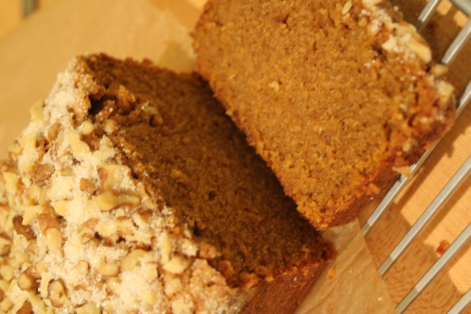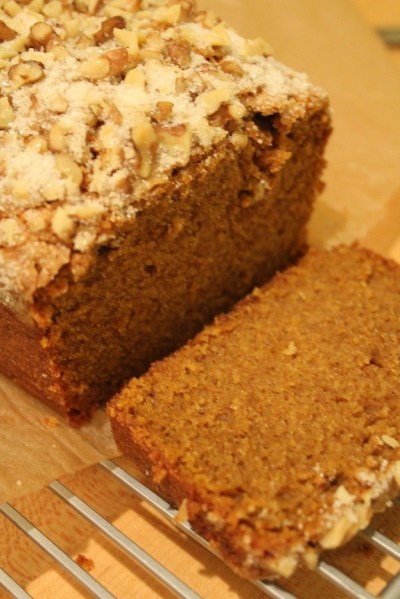 This bread is really lovely. Very subtle in flavor and not too sweet with a dense, moist crumb. I think it would make great muffins next time. Make sure not to over bake, it took about an hour at 325 and it seemed like it was taking forever, be patient. There is still a little left over and I just had a bite with my morning coffee, it has improved with age.