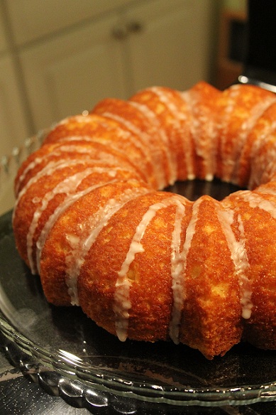 Bake for about 40 – 45 minutes. It is ready when a tester comes out clean. Let sit in the pan on a rack for about 20 minutes, then carefully flip the cake out onto the rack to cool completely.