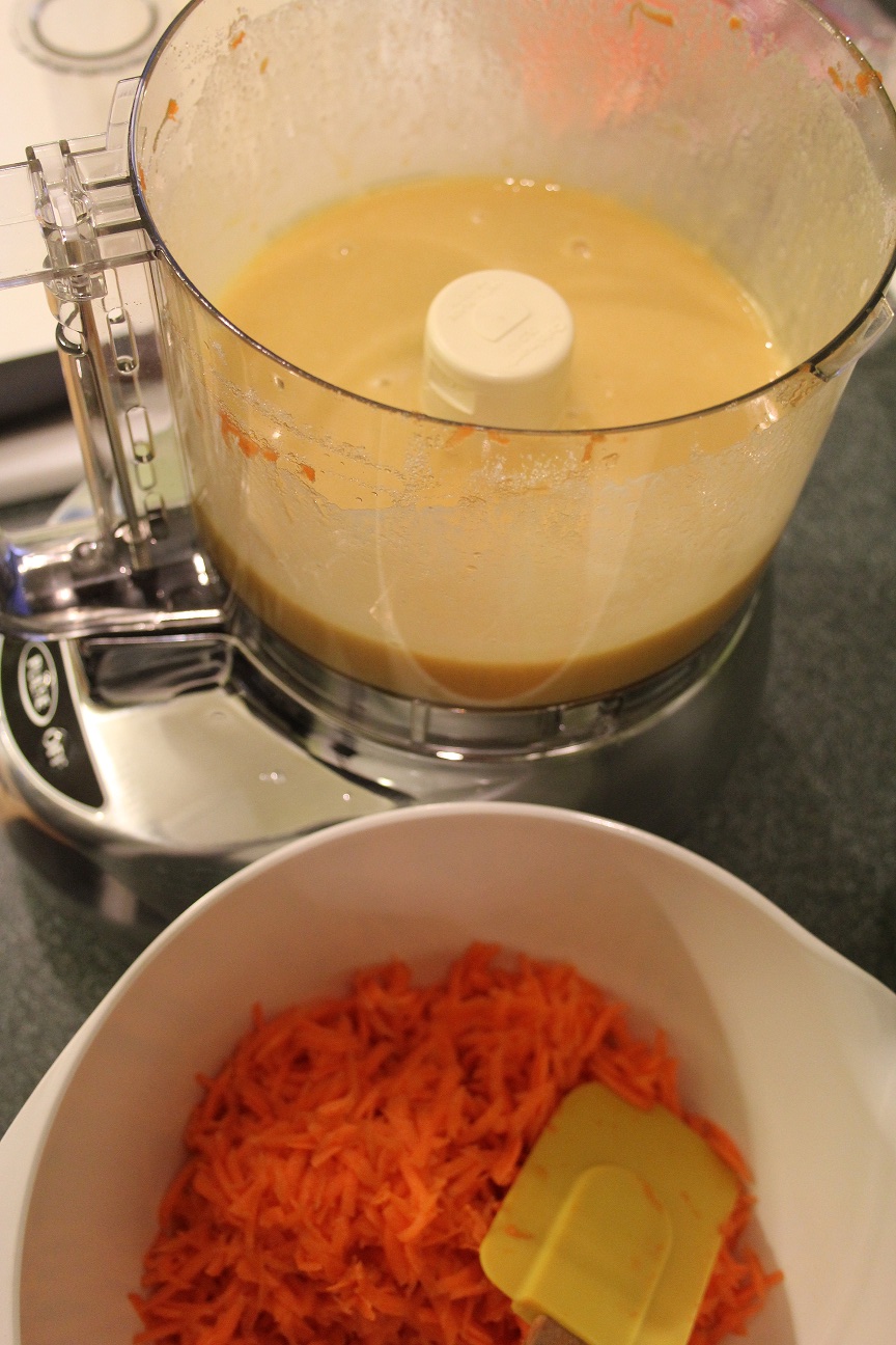 In food processor fitted with large shredding disk, shred carrots (you should have about 1 1/2 cups); transfer carrots to bowl and set aside. Wipe out food processor bowl and fit with metal blade. Process granulated and brown sugars and eggs until frothy and thoroughly combined, about 20 seconds. with machine running, add oil through feed tube in steady stream.  Process until mixture is light in color and well emulsified, about 20 seconds longer.  Scrape mixture into medium bowl and fold in carrots and dry ingredients until incorporated and no streaks of flour remain.