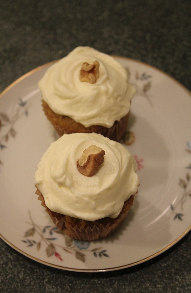I made this carrot cake recipe a few years ago, I remember liking it because it was lighter than the more traditional version with nuts and raisins.  So, when one of my wedding cake clients wanted to try carrot cake for a tasting I decided to revisit it in hopes of creating a flavorful, celebration worthy carrot cake.  It was a huge success, and I was so incredibly pleased with it! The original recipe didn’t call for nuts or raisins, but I added walnuts back in.  The frosting for the wedding cake will be cream cheese swiss buttercream, which is also lighter and has a fluffier, less cloying taste and texture than regular cream cheese frosting.  I had some left over batter and made a few little cupcakes for Bryan and I to try.  I included the recipe for the frosting I used for those, which was really yummy – softened cream cheese lightened with whip cream a little sugar and vanilla.