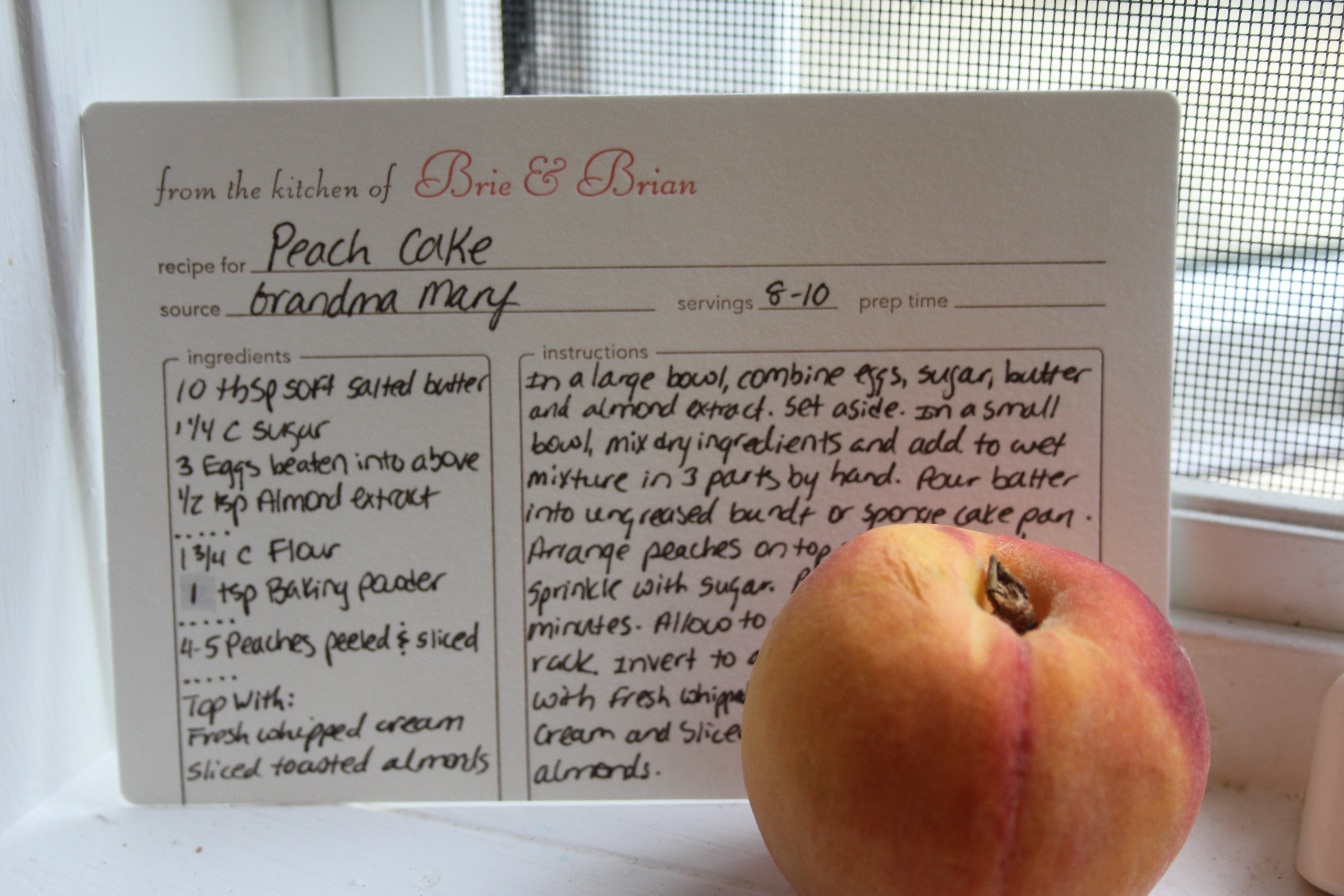 As I mentioned in my last post our friends Brie and Brian got married in Vermont last weekend. It was a beautiful wedding, the whole time Bryan and I were thinking about how two years ago at this time we were prepping for our special day. Brie and Brian chose a beautiful setting at The West Mountain Inn in Arlington, VT. The weekend was relaxed, elegant, and personal. When we sat for the reception we were greeted by a small jar of pink salt and a recipe for Grandma Mary’s Peach Cake! I was so excited about both gifts, but I knew that the peach cake would be made to celebrate our wedding anniversary and memories this year 🙂