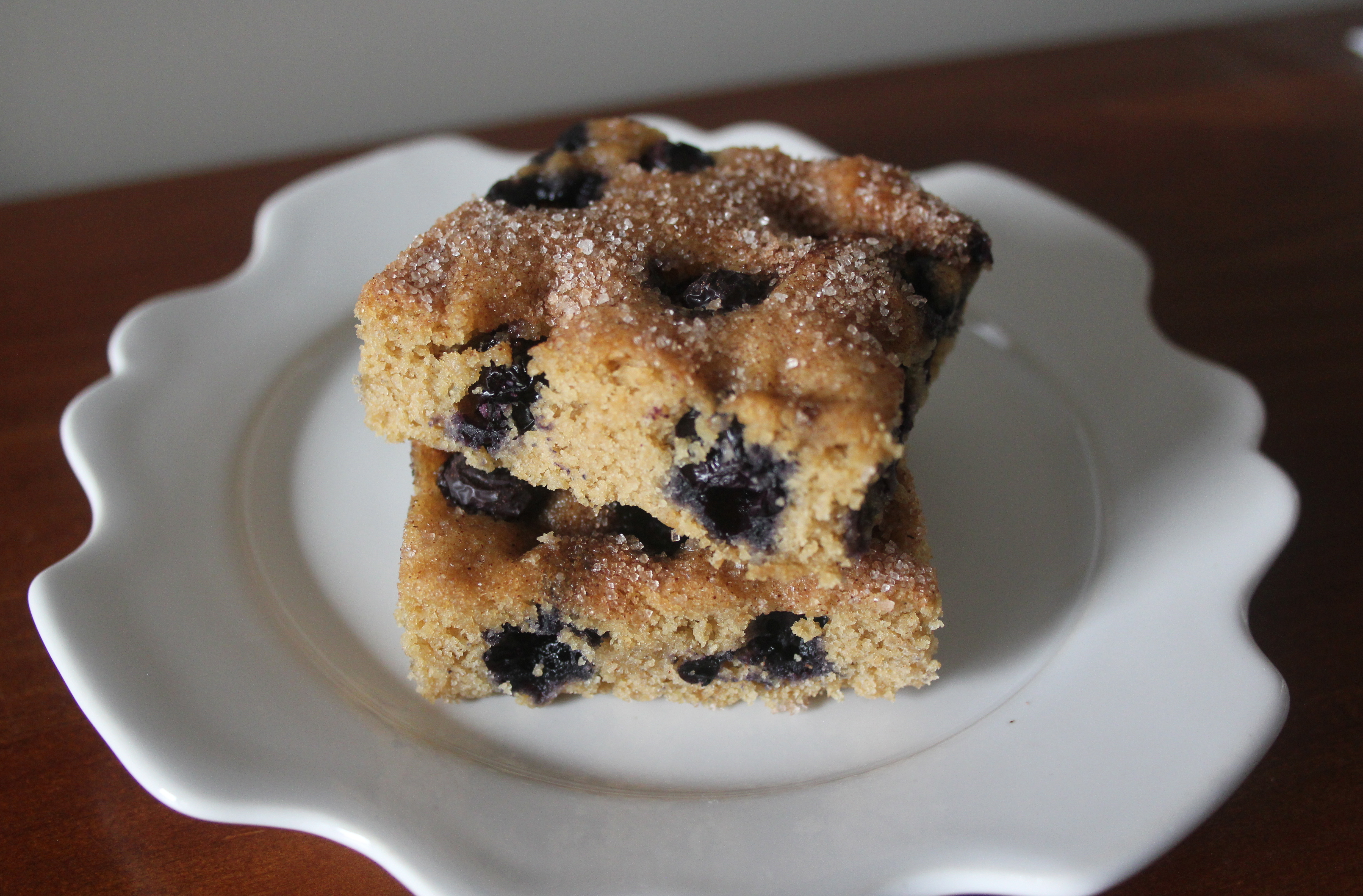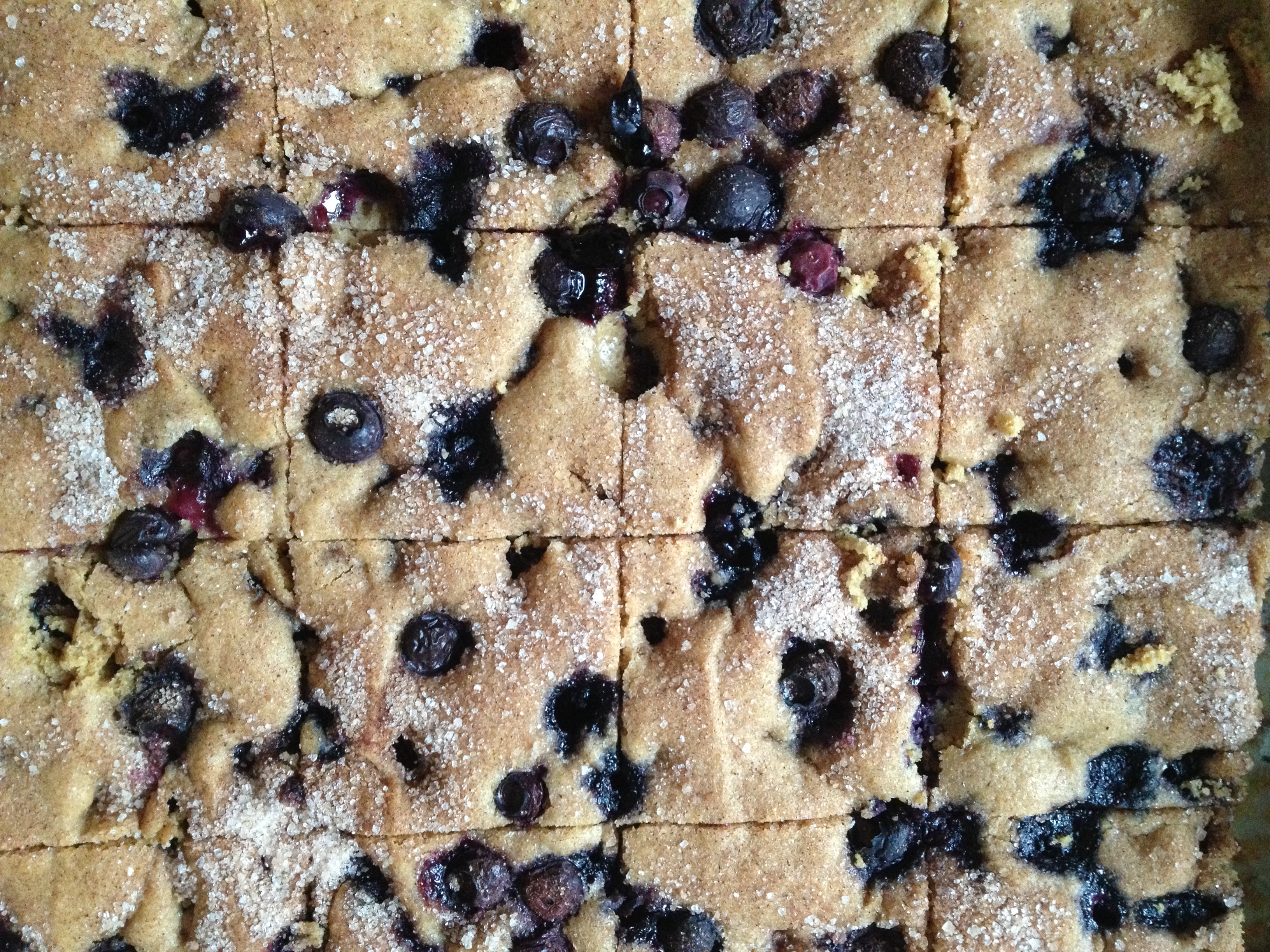 Preheat oven for 350 and grease and line a 9×13 pan with parchment paper. Sift together flour, salt, b.p. Melt the butter in the microwave and transfer to a bowl. With a whisk, beat sugars, eggs and vanilla into the melted butter. Fold in flour with a rubber spatula and then gently fold in berries and nuts (if using). Pour batter into prepared pan, it will be thick and hard to spread but be gentle. I found a butter knife or mini off set spatula worked well. Sprinkle with the sugar and cinnamon. Set timer for 15 min, check and rotate. Bake for another 15, until the edges are just golden and a knife tester comes out clean.