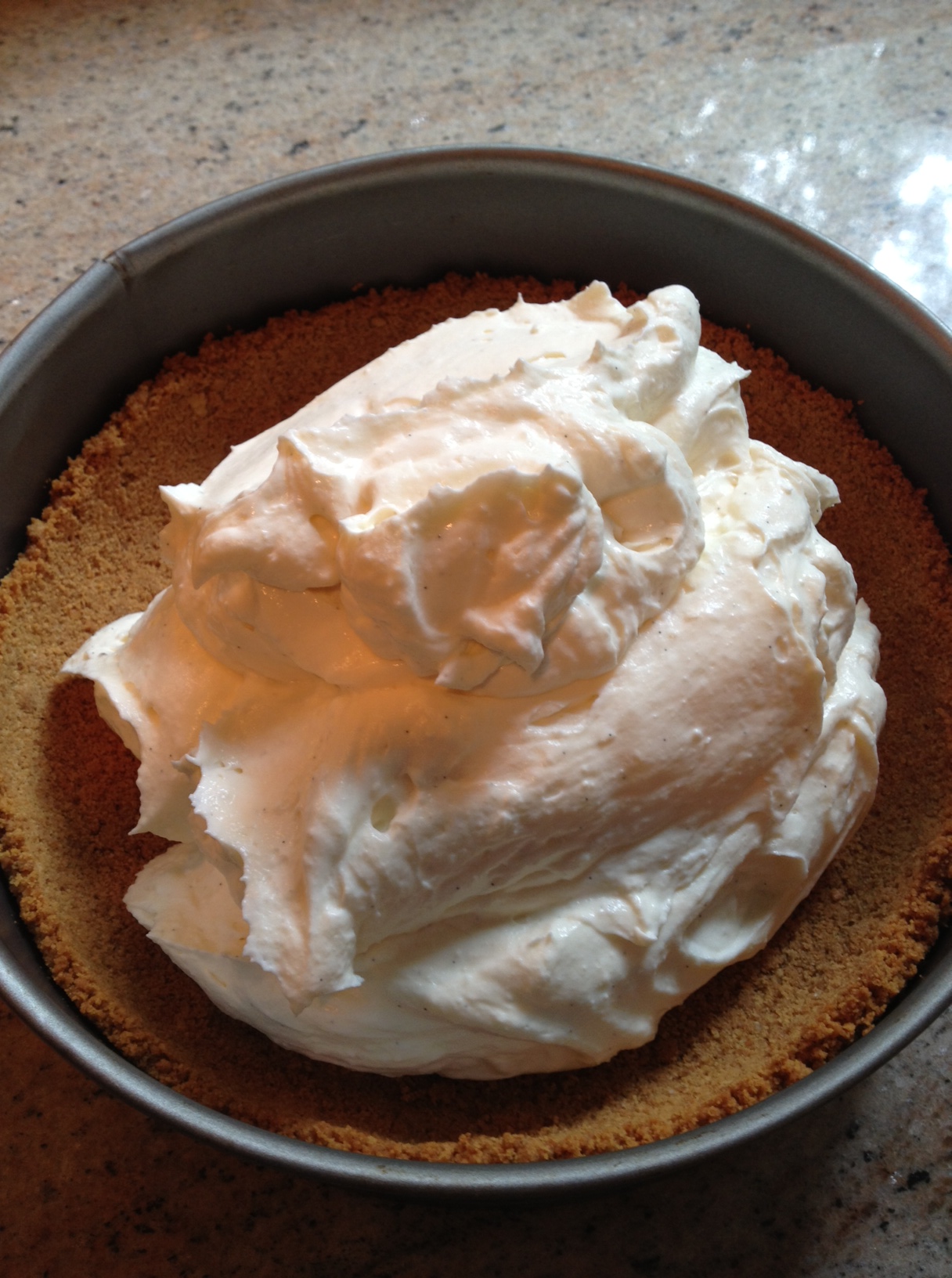 Baking Club theme last month was cheesecake.  I am kind of “ho hum” about cheesecake, I can take it or leave it.  Flavors often seem too sickening sweet and over the top for me.  I think this trend was started by the ever popular Cheesecake Factory.  I often find traditional cheesecakes too dense and one note.  Although, recently I have discovered the wonders of the no-bake cheesecake.  The first one I tried was a year or two ago from Melissa Clark’s cookbook The Last Course, it was light and fluffy but didn’t have enough tang for me.  As I thought about what to make for Baking Club I came across a recipe in Food & Wine that described the cheesecake as having “an ethereally light, creamy texture and fantastic crunchy crust made from honey graham crackers”.  How could I pass that up?!