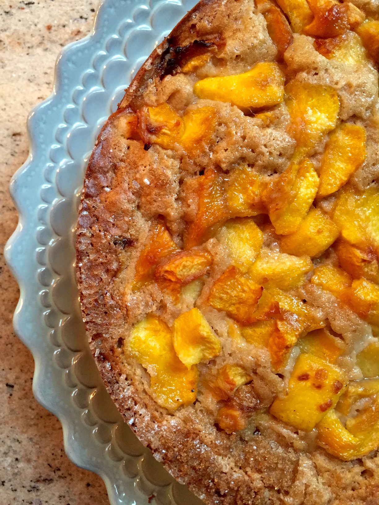 Preheat oven to 350 degrees (convection setting if you have it). Spray an 8 or 9 inch round cake pan and line bottom with a circle of parchment.  In a bowl, whisk together melted gelato, oil, eggs and vanilla.  In another bowl whisk together flour, b.s., cinnamon and salt.  Fold flour mixture into gelato mixture till just combined.  Fold in half the peaches and pour into the prepared pan.  Scatter the remaining peaches over the top and sprinkle with brown sugar.
