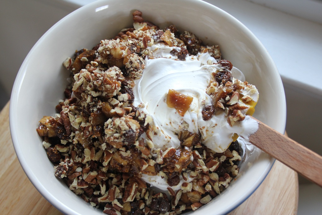 For the filling, transfer one-third of the frosting to a medium bowl. Drain raisins and figs, stir into the frosting along with walnuts.